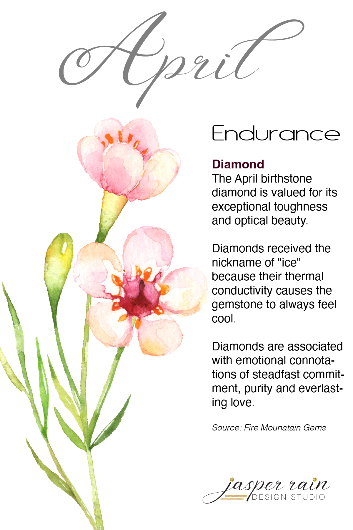 The April birthstone diamond is valued for its exceptional toughness and optical beauty. Diamonds received the nickname of "ice" because their thermal conductivity causes the gemstone to always feel cool. Diamonds are associated with emotional connotations of steadfast commitment, purity and everlasting love.