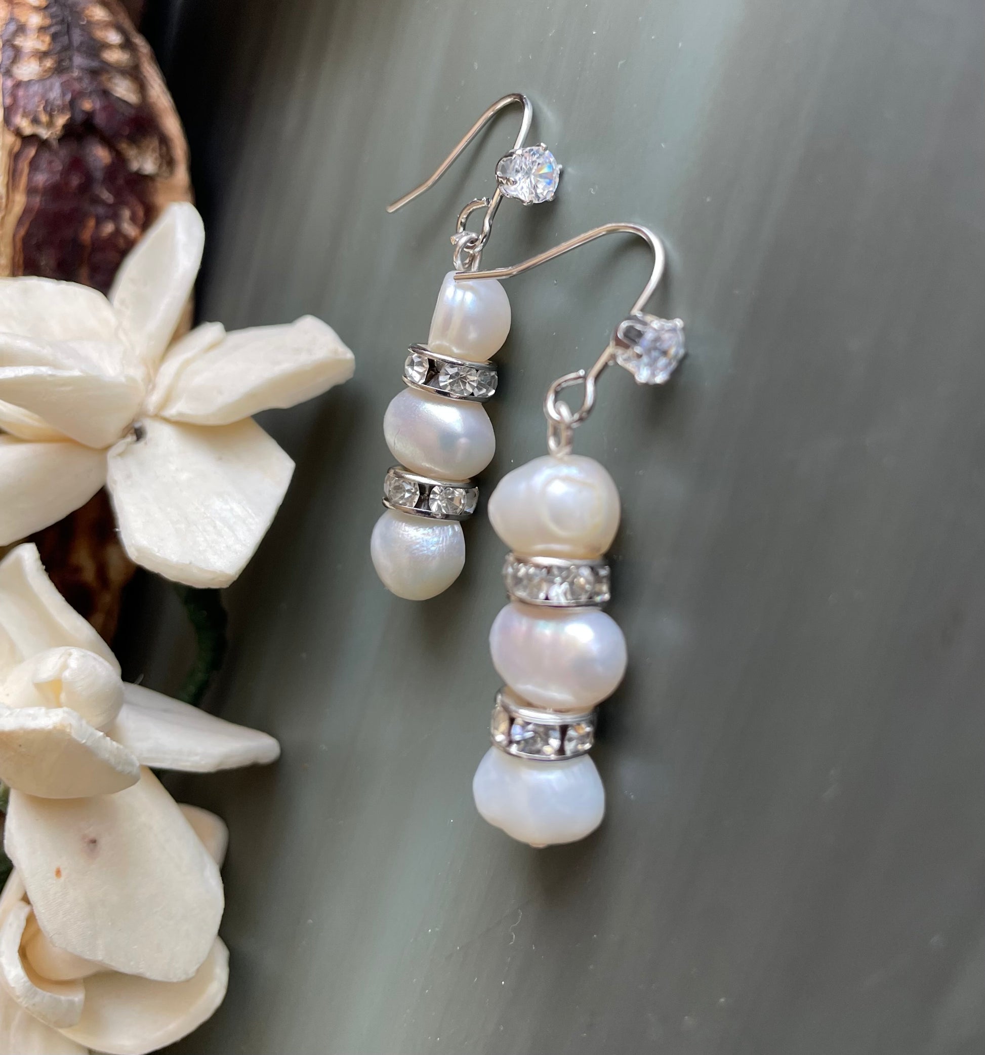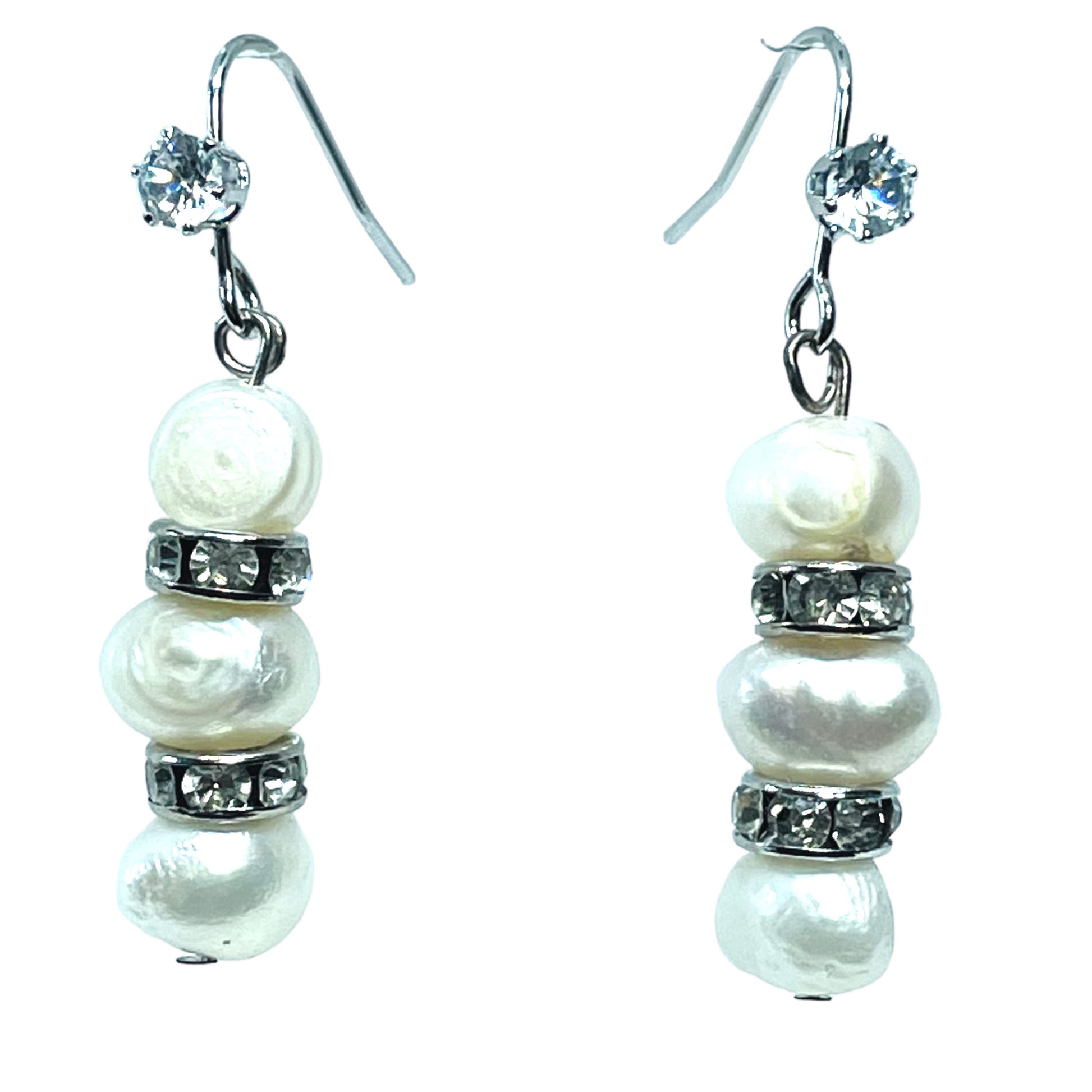 Handmade Crystal diamond, freshwater pearls and metal crystal earrings with stainless steel earring wires. The earrings are 1.5 inches long.