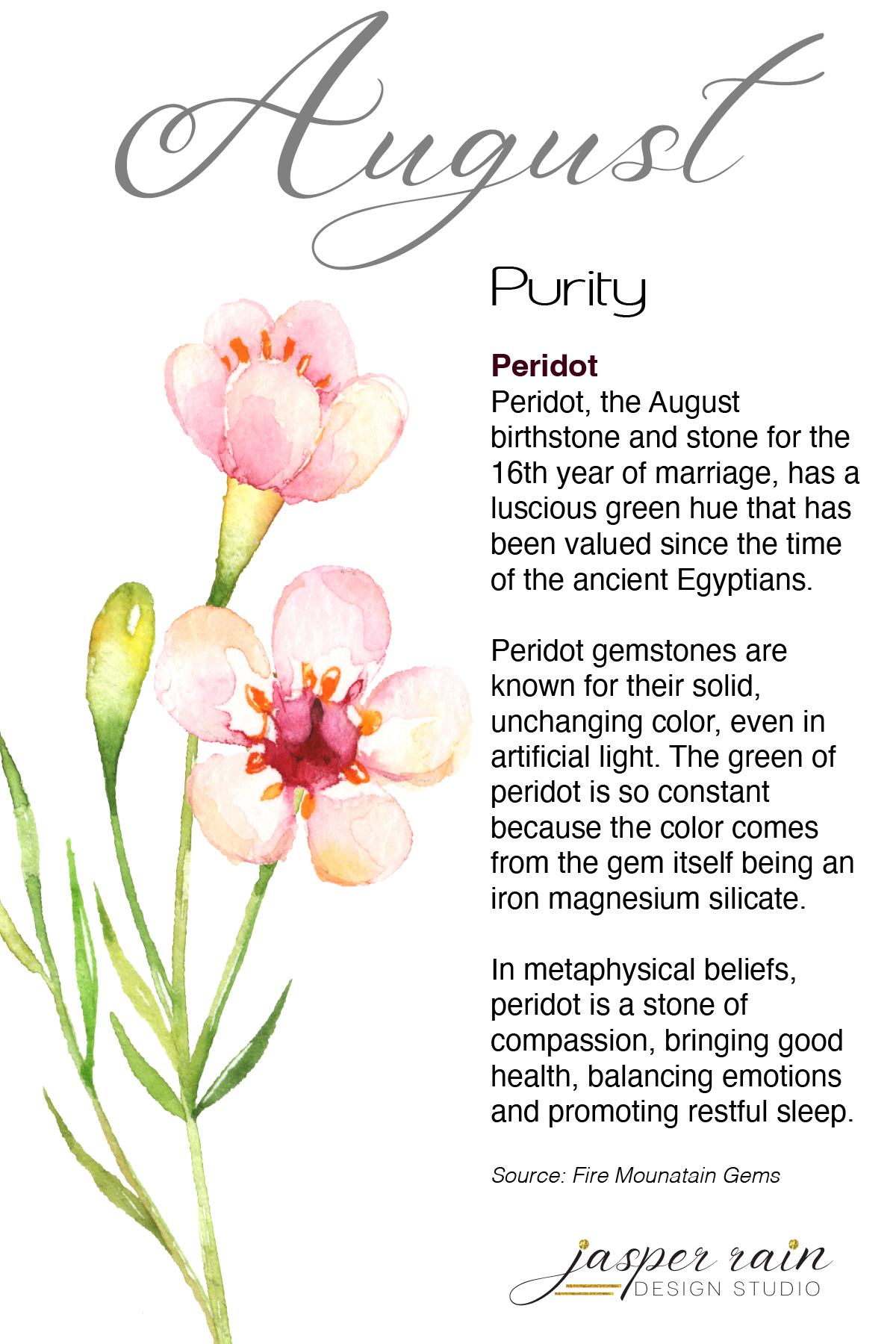 Peridot, the August birthstone and stone for the 16th year of marriage, has a luscious green hue that has been valued since the time of the ancient Egyptians. Peridot gemstones are known for their solid, unchanging color, even in artificial light. The green of peridot is so constant because the color comes not from impurities, but from the gem itself being an iron magnesium silicate. In metaphysical beliefs, peridot is a stone of compassion, bringing good health, balancing emotions and promoting restful sleep.