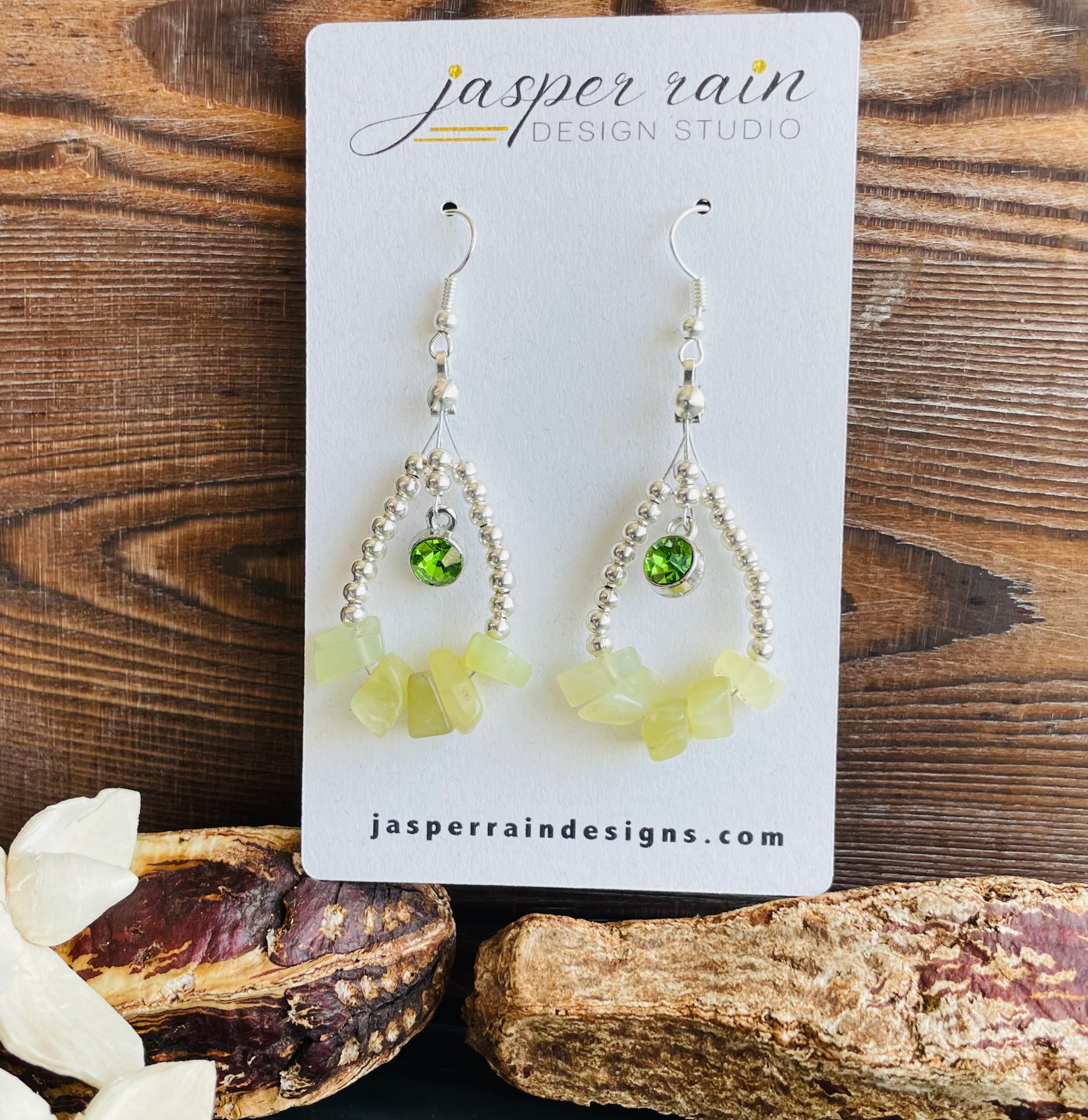 Handmade Peridot cystals and Prehnite chips and stainless steel bead earrings on stainless steel earring wires. They are 2 inches long