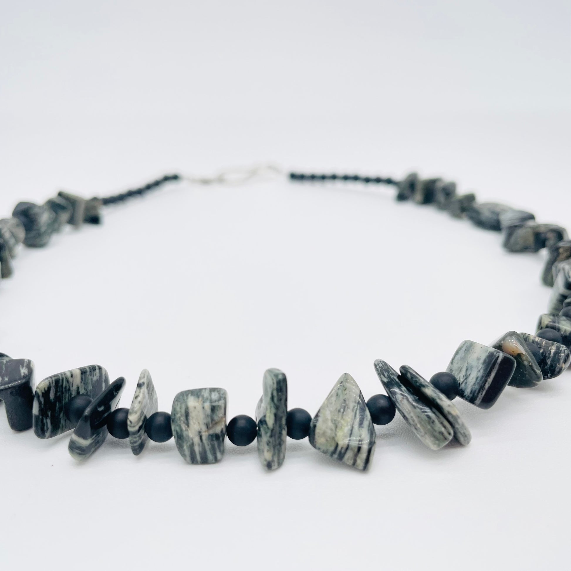 Discover the epitome of masculine elegance with our handmade Men's Gemstone Necklace. Meticulously crafted using a blend of Black Silk Stone chip beads and Matte Black Onyx gemstones, this necklace exudes a sense of strength and sophistication. Elevate your style with the dark allure of these genuine gemstones, carefully chosen to create a piece that complements any look.