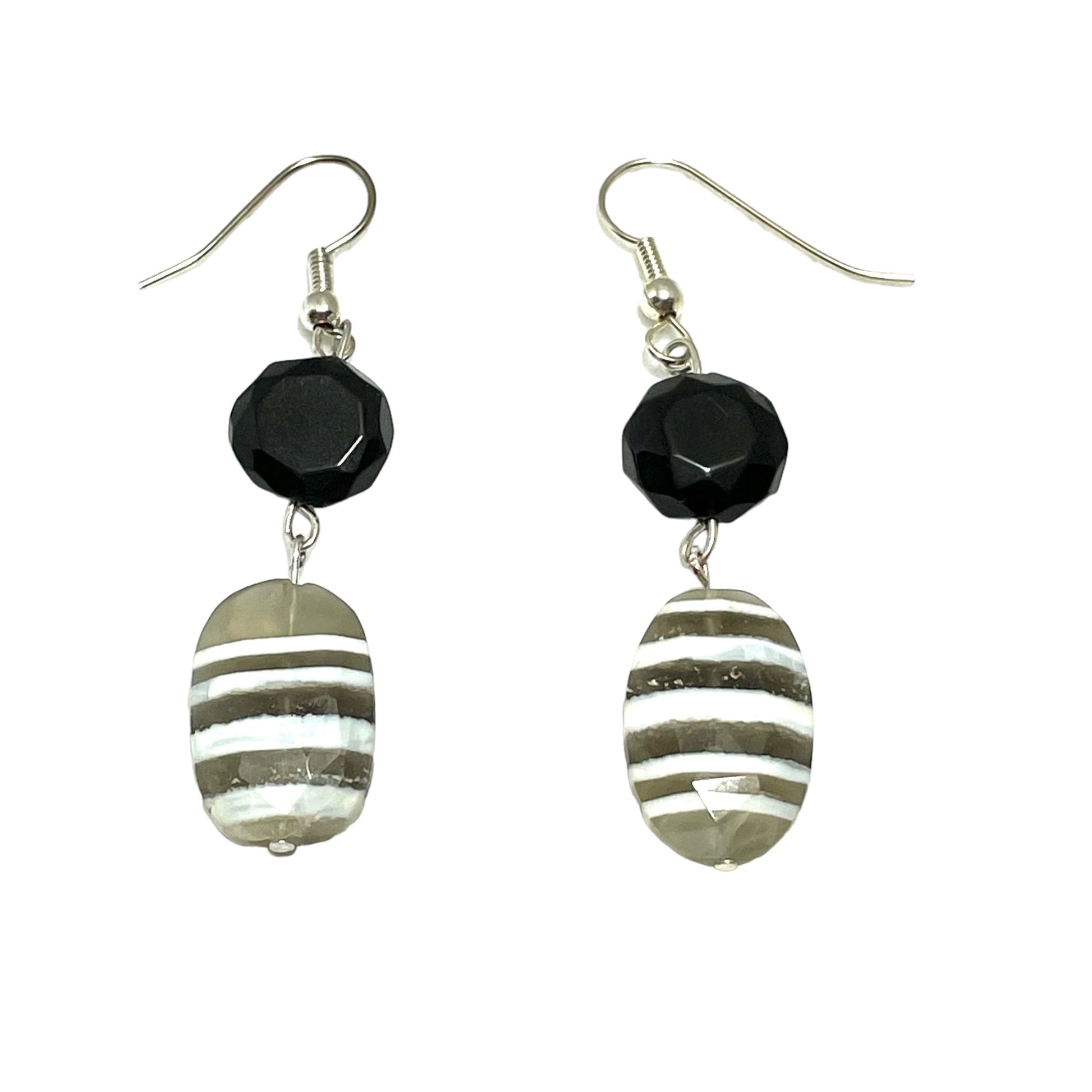 Faceted Blue Denim Opal and faceted Rainbow Obsidian dangle earrings. They hang at 2.5 inches on sterling silver earring wires. Each opal stone is very unique which makes each pair unique.