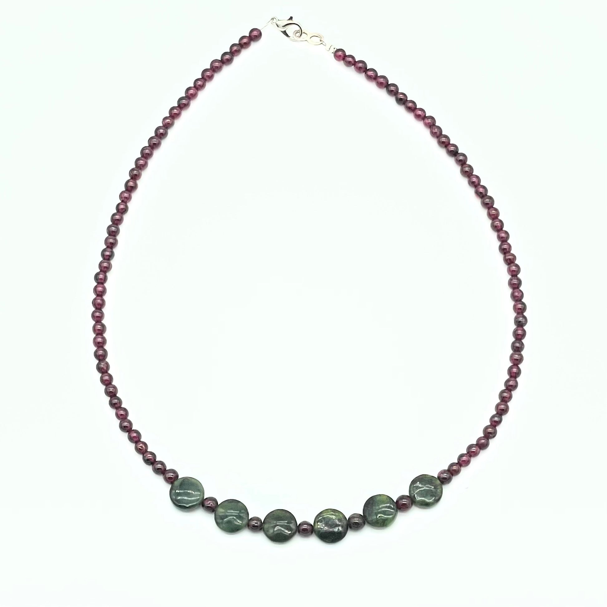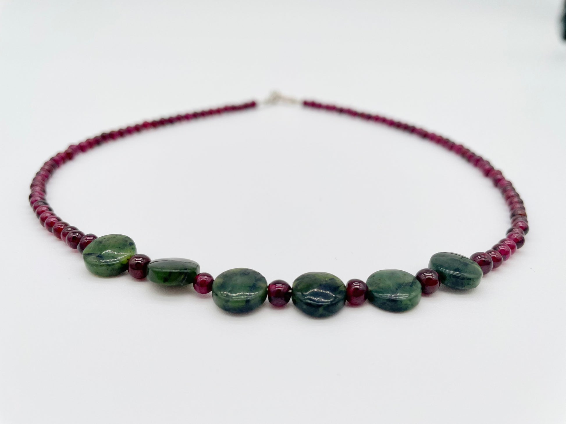 Embrace the beauty of nature with our Natural Garnet and Jade Necklace. This delicate piece is designed to enhance your everyday look with a touch of sophistication. The centerpiece of this necklace is a genuine natural garnet gemstone, known for its rich red hue and inherent symbolism of passion and vitality. It's paired with the dark green color of jade for a lovely look.