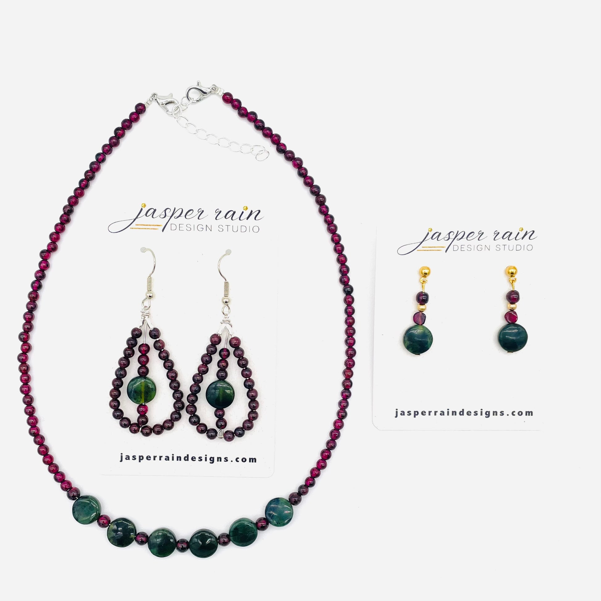 Dainty natural Garnet and Jade gemstone necklace. The necklace is 18 inches long with a stainless steel lobster clasp. You can add a chain extender for a longer look. You can also add matching earrings for a complete look. When you buy 2 pieces, save 10%. Buy 3 or more pieces in this collection and save 15%