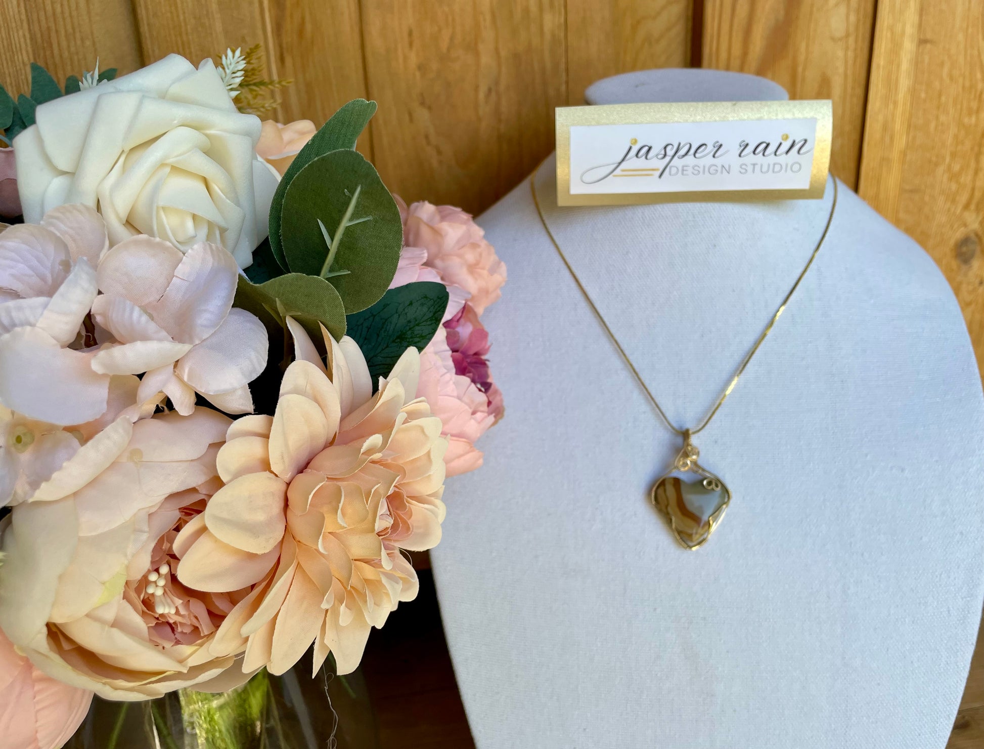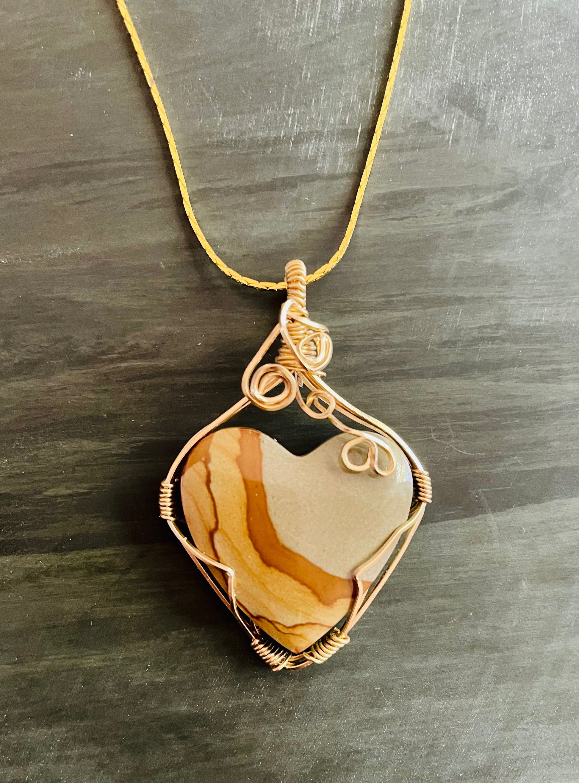 Owyhee Picture Jasper Pendant wire-wrapped in gold-filled wire which is durable and won't tarnish.. It hangs on a gold 20 inch chain.