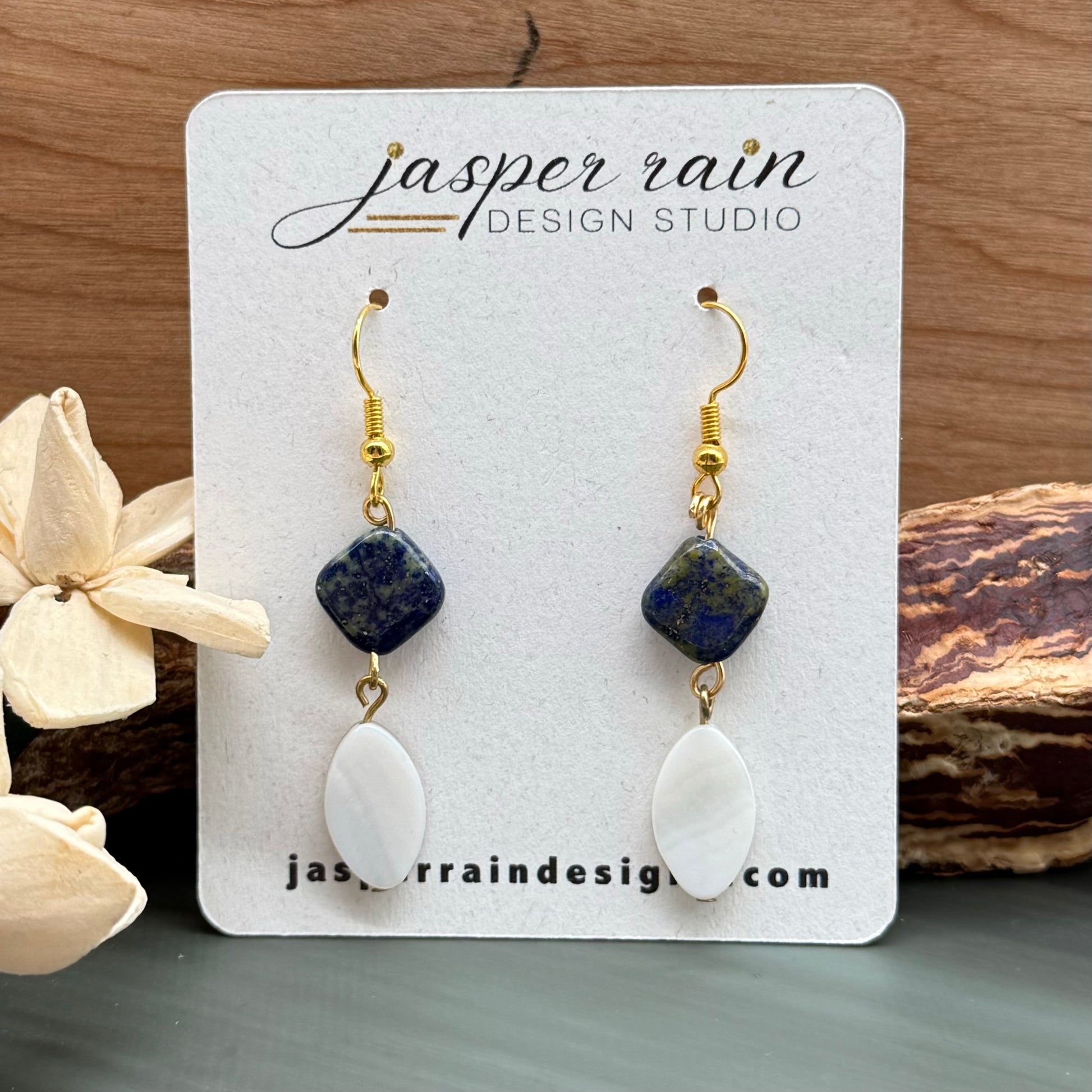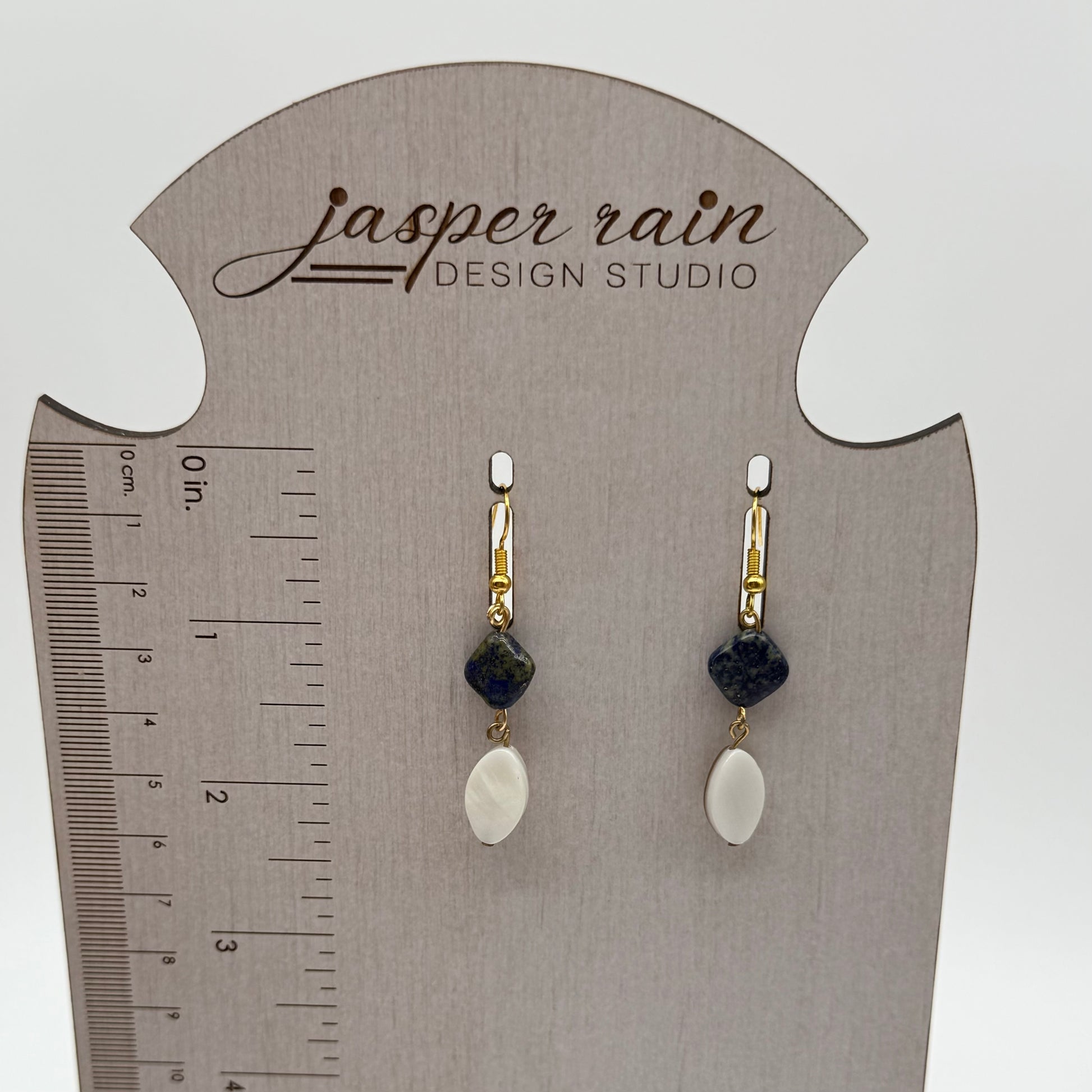 Elegant freshwater pearl and mother of pearl shell earrings paired with rich green emeralds for understated sophistication. These classic pieces feature stainless steel wires that resist tarnishing, making them ideal for sensitive skin. The earthy emerald tones complement the lustrous pearl finish beautifully, creating a timeless aesthetic that transitions seamlessly from day to evening wear. Hanging at one inch, they offer a refined proportion that flatters most face shapes without overwhelming delicate features.