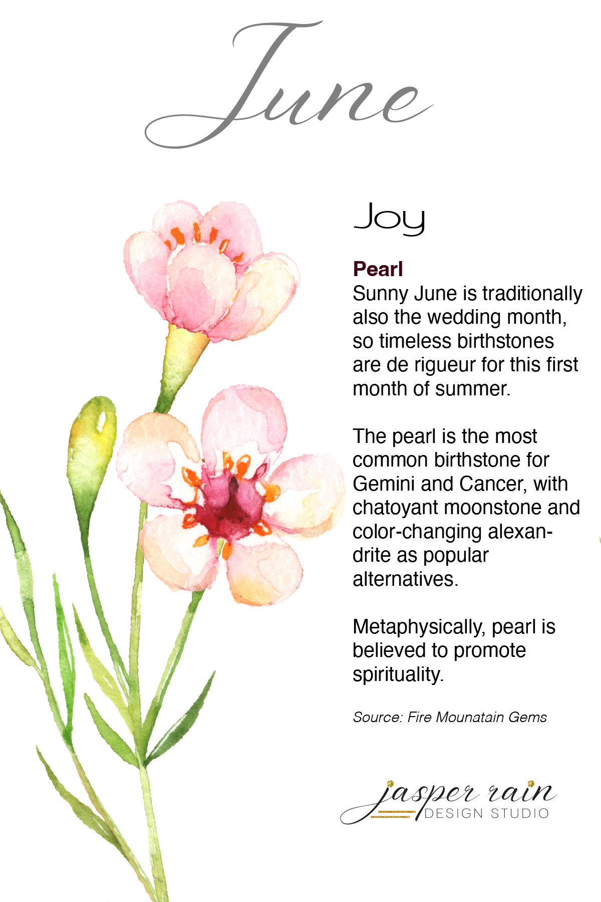Sunny June is traditionally also the wedding month, so timeless birthstones are de rigueur for this first month of summer. The pearl is the most common birthstone for Gemini and Cancer, with chatoyant moonstone and color-changing alexandrite as popular alternatives. Metaphysically, pearl is believed to promote spirituality, while moonstone is thought to increase calm and alexandrite is used to expand creativity.