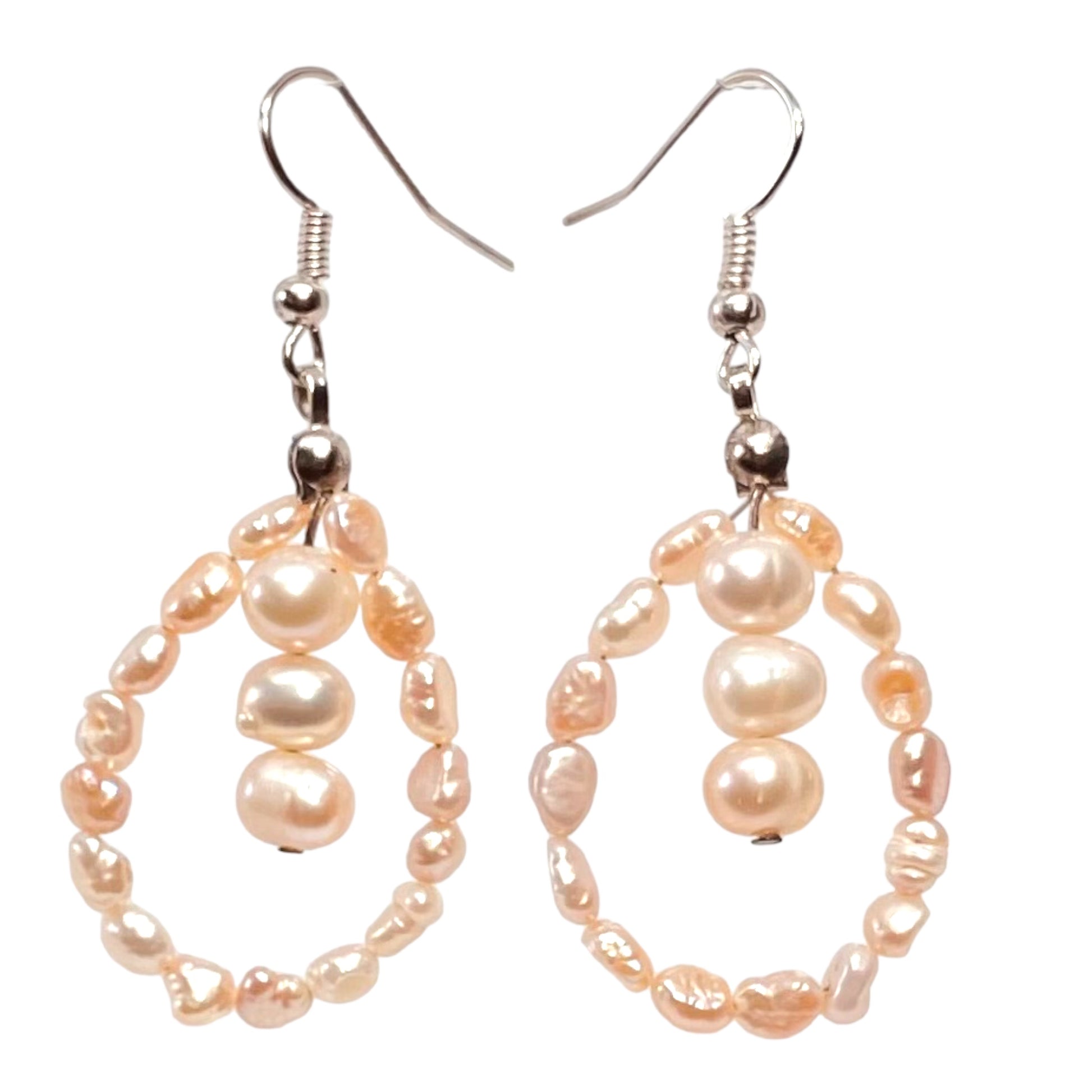 Natural light pink freshwater pearl earrings. The earrings dangle at 1 inch long and are on stainless steel earring wires.