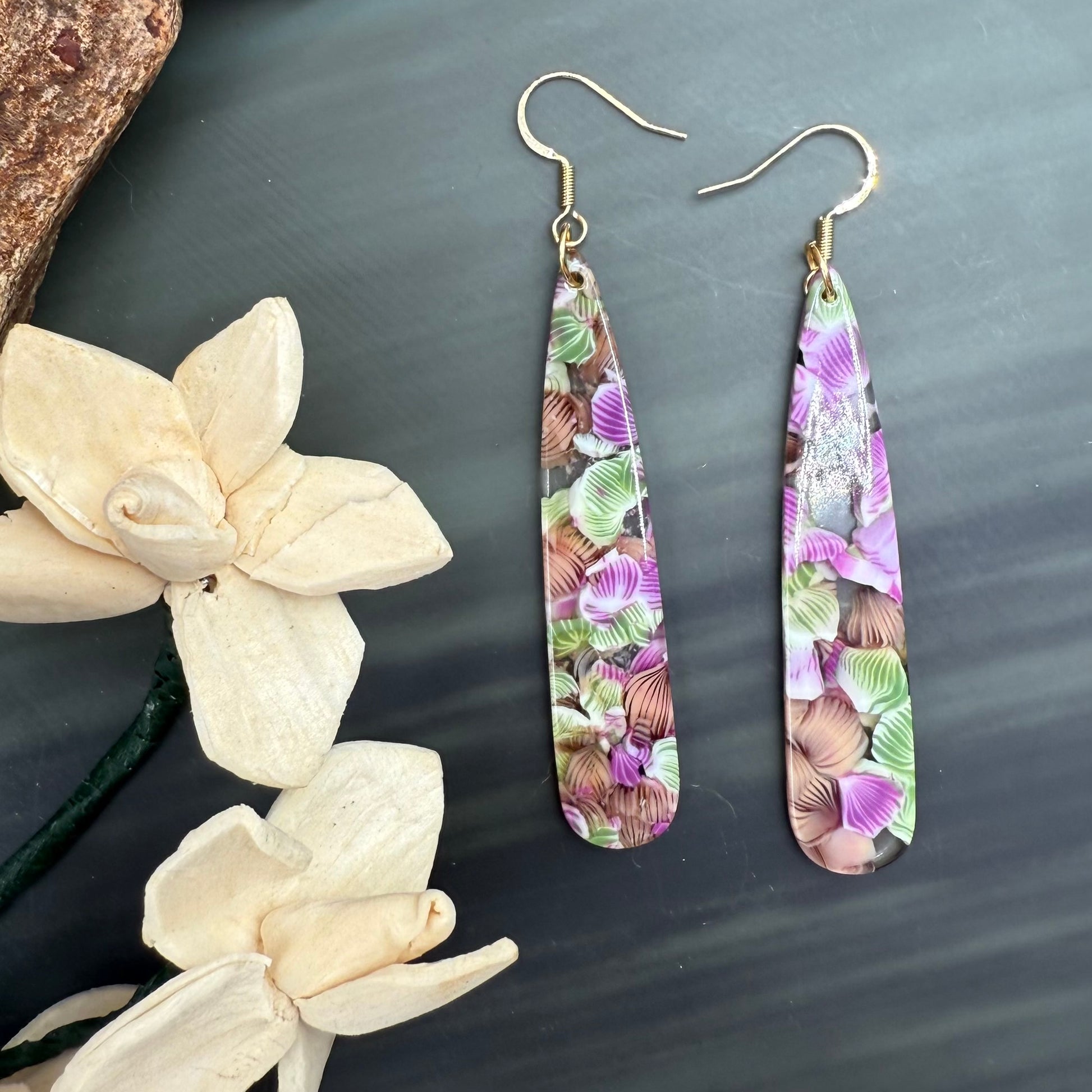 Purple and green flowers suspended in crystal-clear resin create an elegant statement with these long dangle earrings. Measuring 3.5 inches, their slender silhouette flatters the face while showcasing nature's delicate beauty. Crafted with nickel-free silver earring wires, these pieces offer both style and comfort for sensitive skin. Perfect for those seeking botanical-inspired jewelry that combines artisanal resin work with refined metalwork.