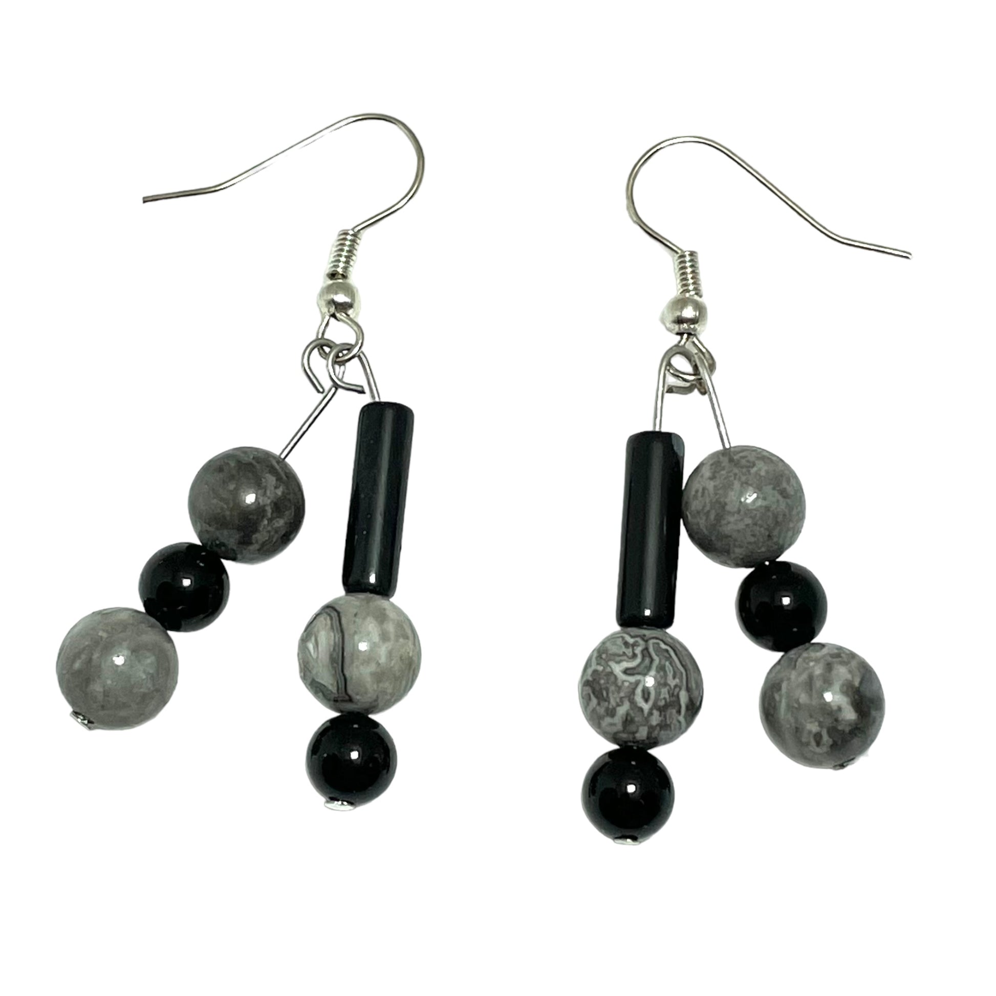 Silver Crazy Lace Agate and Black Onyx drop earrings.