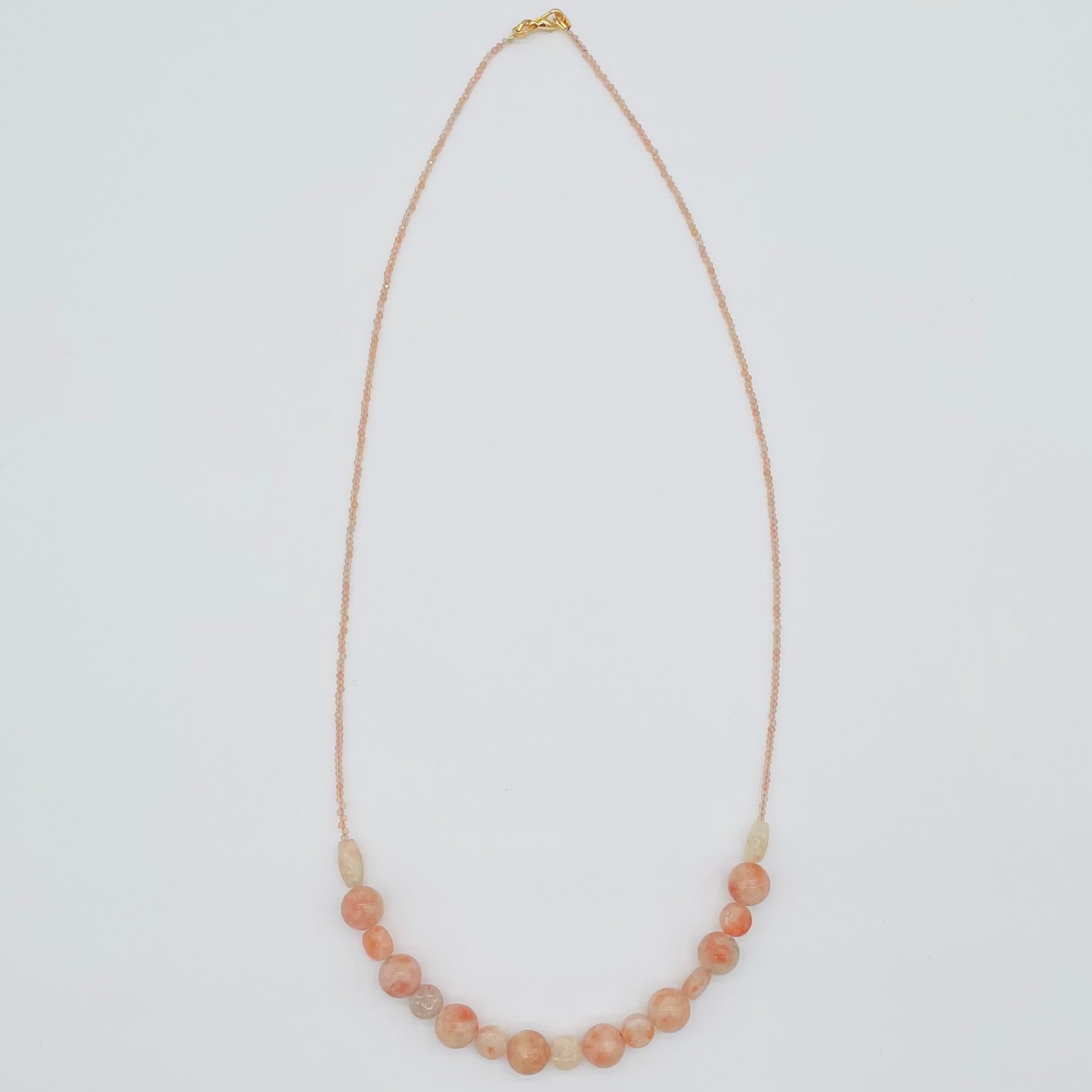 Sparkling Sunstone long necklace with micro sunstone beads and large round beads. The necklace is 24 inches long with a gold colored brass lobster clasp.