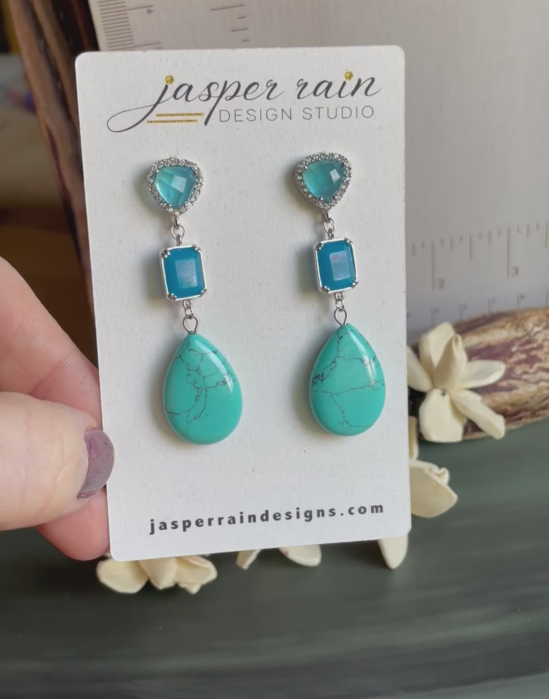 Vivid turquoise Howlite teardrops with faceted square sky blue Chalcedony rectangles, blue Topaz and cubic zircon pave trillions stud earrings. Silver plated stud post earrings at 2 inches long.