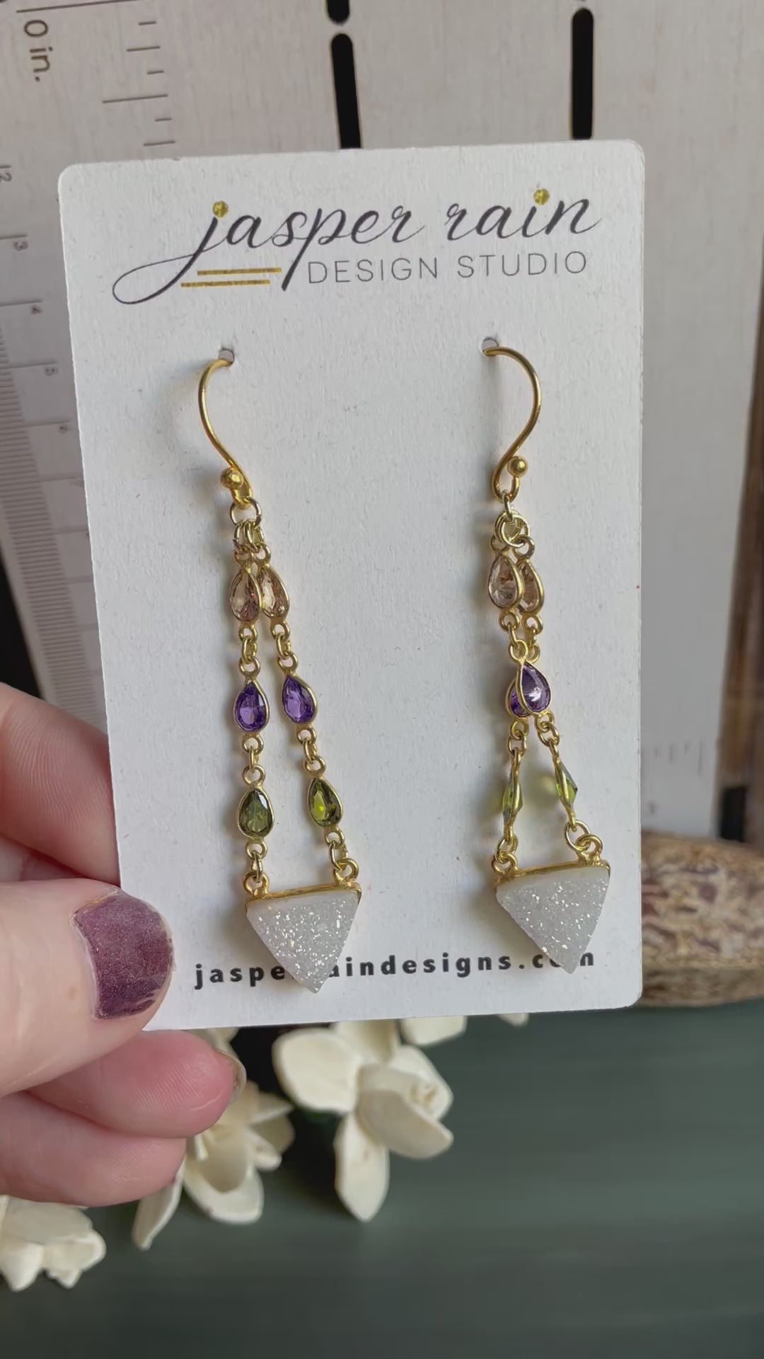 Iridescent white druzy crystal triangles with tiny faceted olive green peridot, tanzanite and citrine gemstones on chains. They are on 24k gold earring hooks and hang at 3 inches long.
